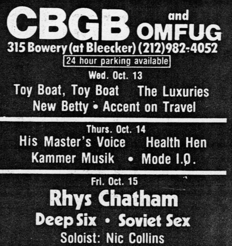 I arrive Downtown, opening for Rhys Chatham at CBGB, October 1982.