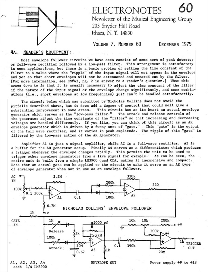 The author's first publication, a circuit design for an envelope follower, in Electronotes Vol. 7 No. 60, December 1975.